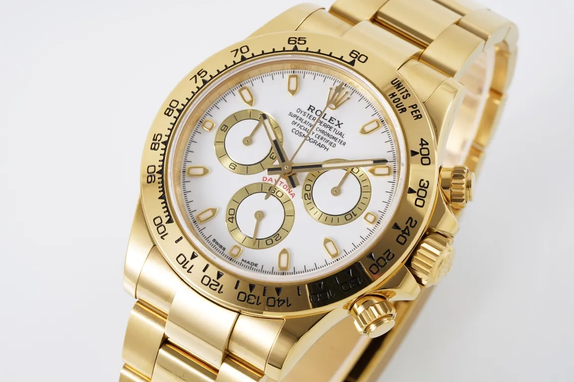 Rolex Daytona 4130 Gold Full Gold Chronograph Watch – Swiss A-Grade Watches Quality — Premium 1:1 super clone. Case: 904L stainless steel case and bracelet. Crystal: Genuine sapphire crystal with AR coating. Movement: Clone Cal. 4130 (column-wheel flyback chronograph). 12-month movement warranty. Free worldwide shipping on orders over $1,200.