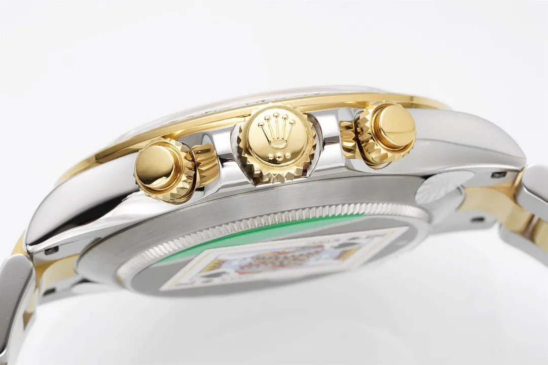 Rolex Daytona 4130 – Two-Tone Gold/Steel, Black Dial, Luxury Chronograph — Premium 1:1 super clone. Case: 904L stainless steel case and bracelet. Crystal: Genuine sapphire crystal with AR coating. Movement: Clone Cal. 4130 (column-wheel flyback chronograph). 12-month movement warranty. Free worldwide shipping on orders over $1,200.