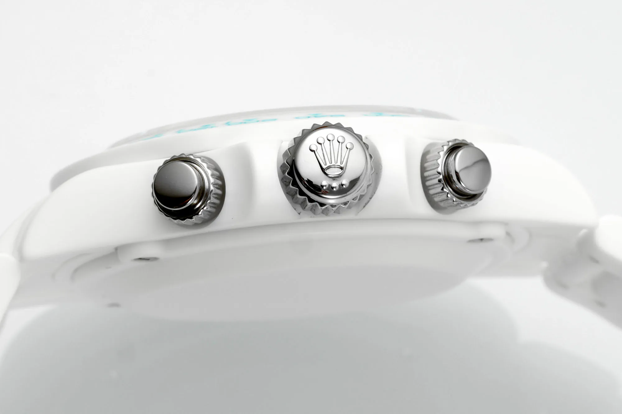 Rolex Daytona Ceramic Watch – White Strap, Turquoise Dial — Premium 1:1 super clone. Case: 904L stainless steel case and bracelet. Crystal: Genuine sapphire crystal with AR coating. Movement: Clone Cal. 4130 (column-wheel flyback chronograph). 12-month movement warranty. Free worldwide shipping on orders over $1,200.