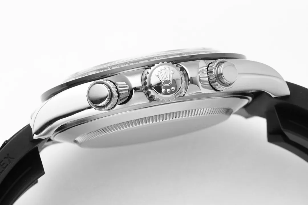 Rolex Daytona Cosmograph Watch – Silver Dial, Black Rubber Strap — Premium 1:1 super clone. Case: 904L stainless steel case and bracelet. Crystal: Genuine sapphire crystal with AR coating. Movement: Clone Cal. 4130 (column-wheel flyback chronograph). 12-month movement warranty. Free worldwide shipping on orders over $1,200.