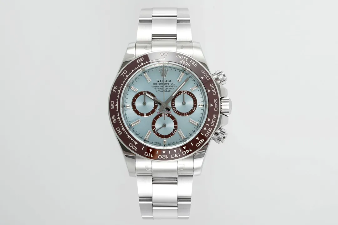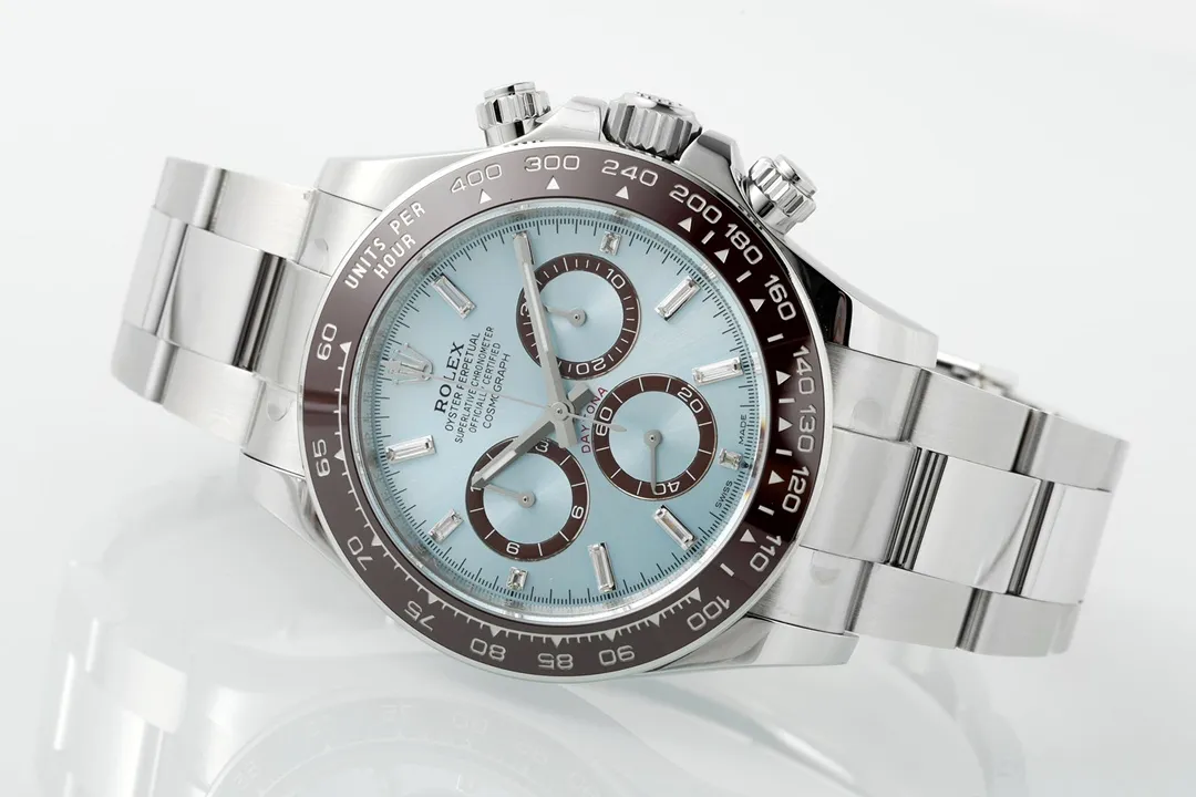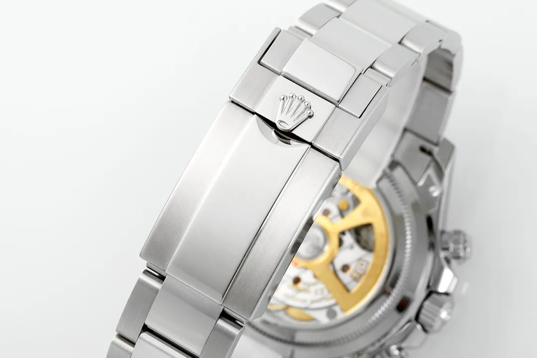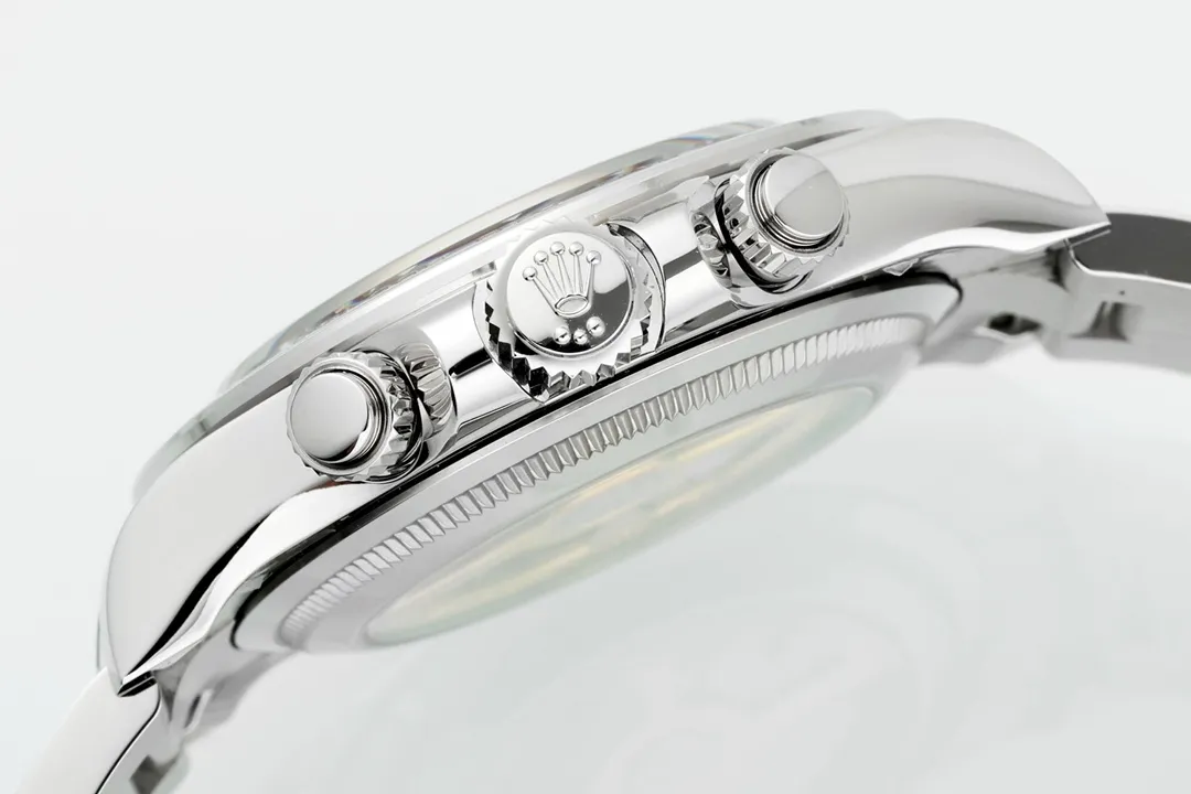 Rolex Daytona – Silver Stainless Steel, Blue Dial, Premium Chronograph — Premium 1:1 super clone. Case: 904L stainless steel case and bracelet. Crystal: Genuine sapphire crystal with AR coating. Movement: Clone Cal. 4130 (column-wheel flyback chronograph). 12-month movement warranty. Free worldwide shipping on orders over $1,200.