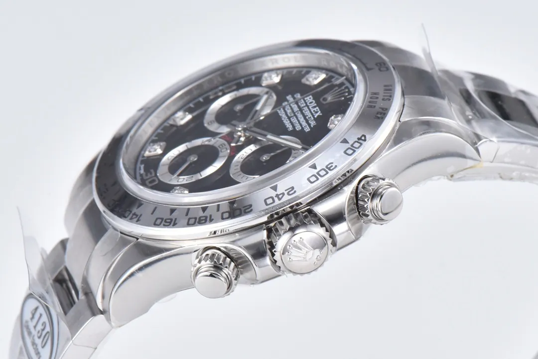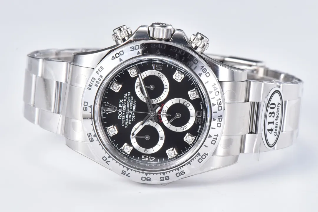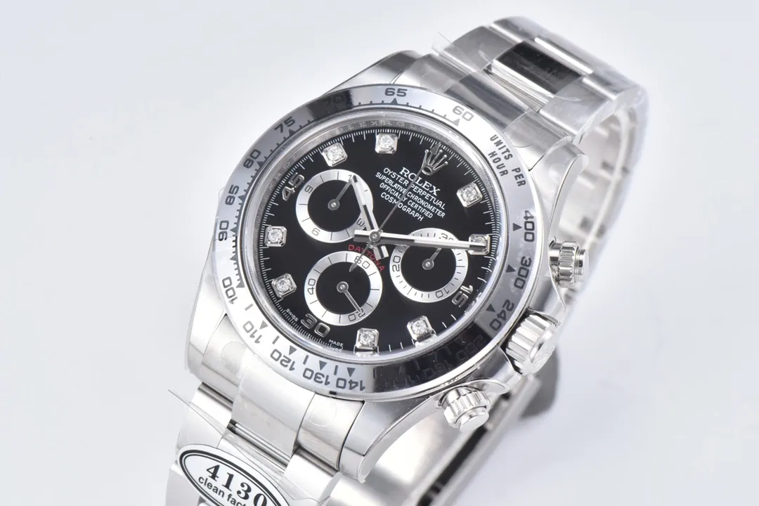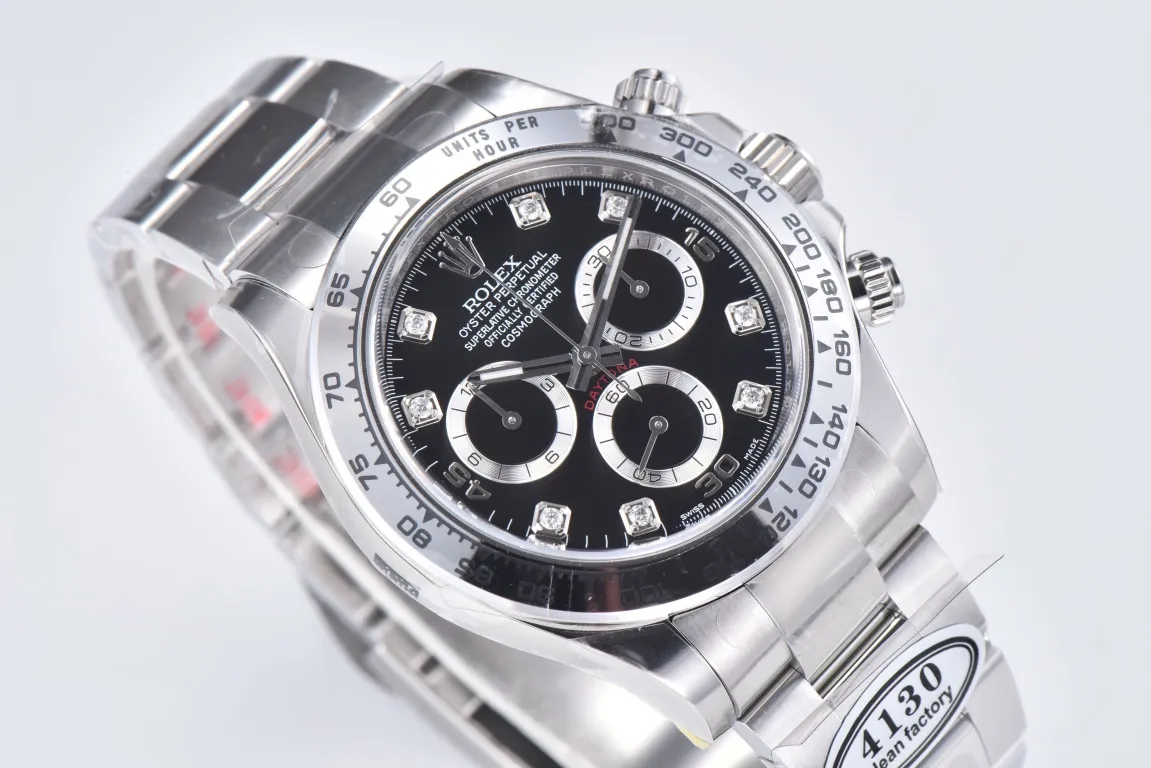 Rolex Daytona Watch – Black Enamel Dial with Moissanite Diamonds — Premium 1:1 super clone. Case: 904L stainless steel case and bracelet. Crystal: Genuine sapphire crystal with AR coating. Movement: Clone Cal. 4130 (column-wheel flyback chronograph). 12-month movement warranty. Free worldwide shipping on orders over $1,200.