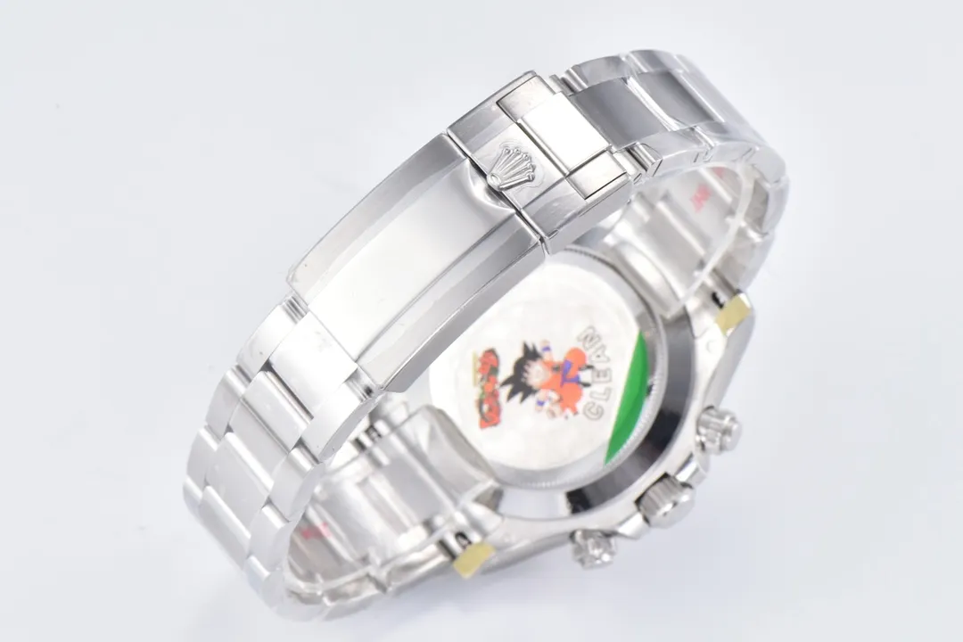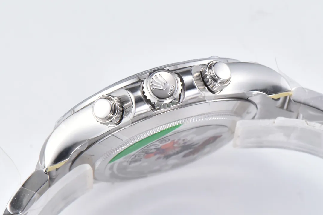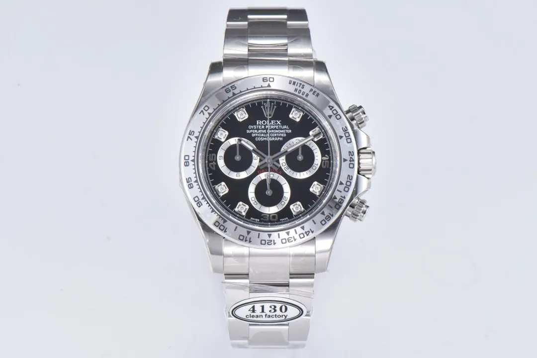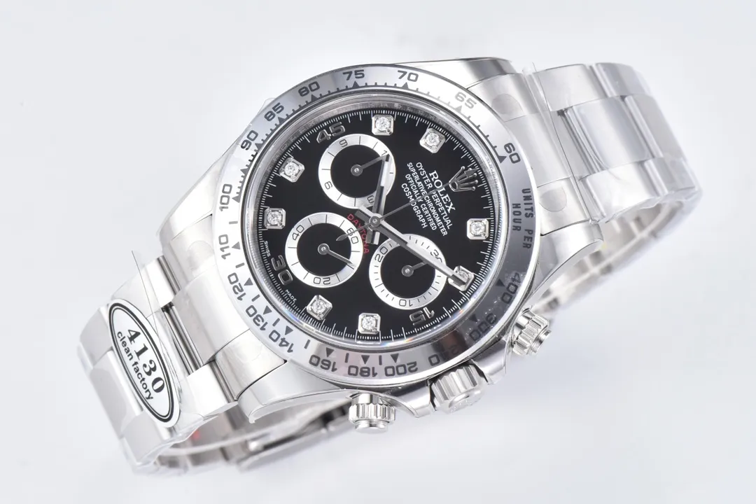 Rolex Daytona Watch – Black Enamel Dial with Moissanite Diamonds — Premium 1:1 super clone. Case: 904L stainless steel case and bracelet. Crystal: Genuine sapphire crystal with AR coating. Movement: Clone Cal. 4130 (column-wheel flyback chronograph). 12-month movement warranty. Free worldwide shipping on orders over $1,200.