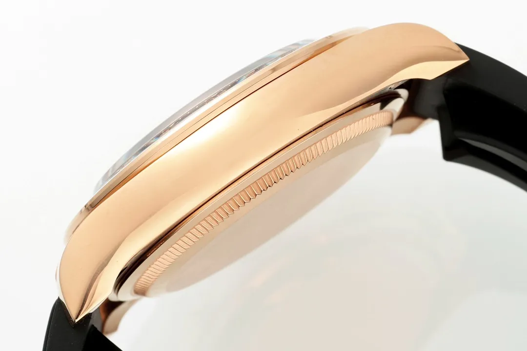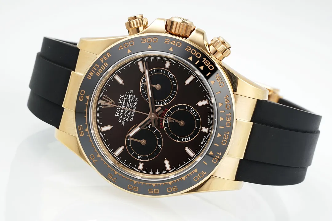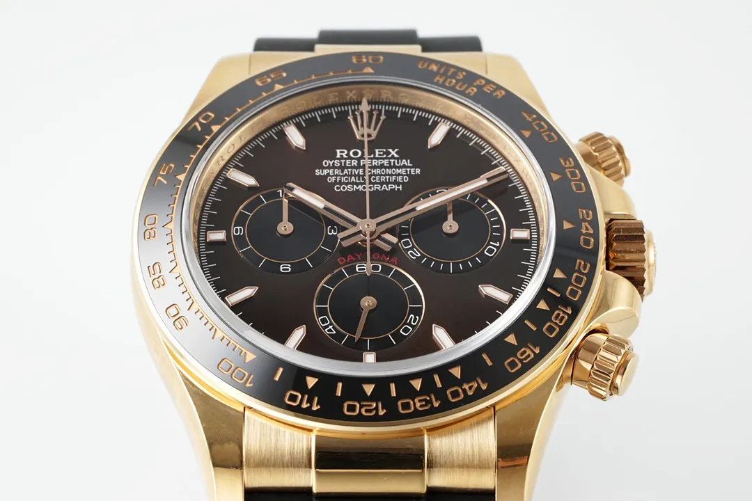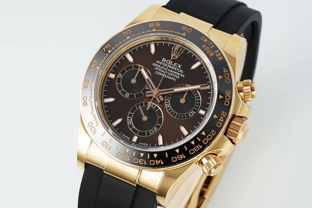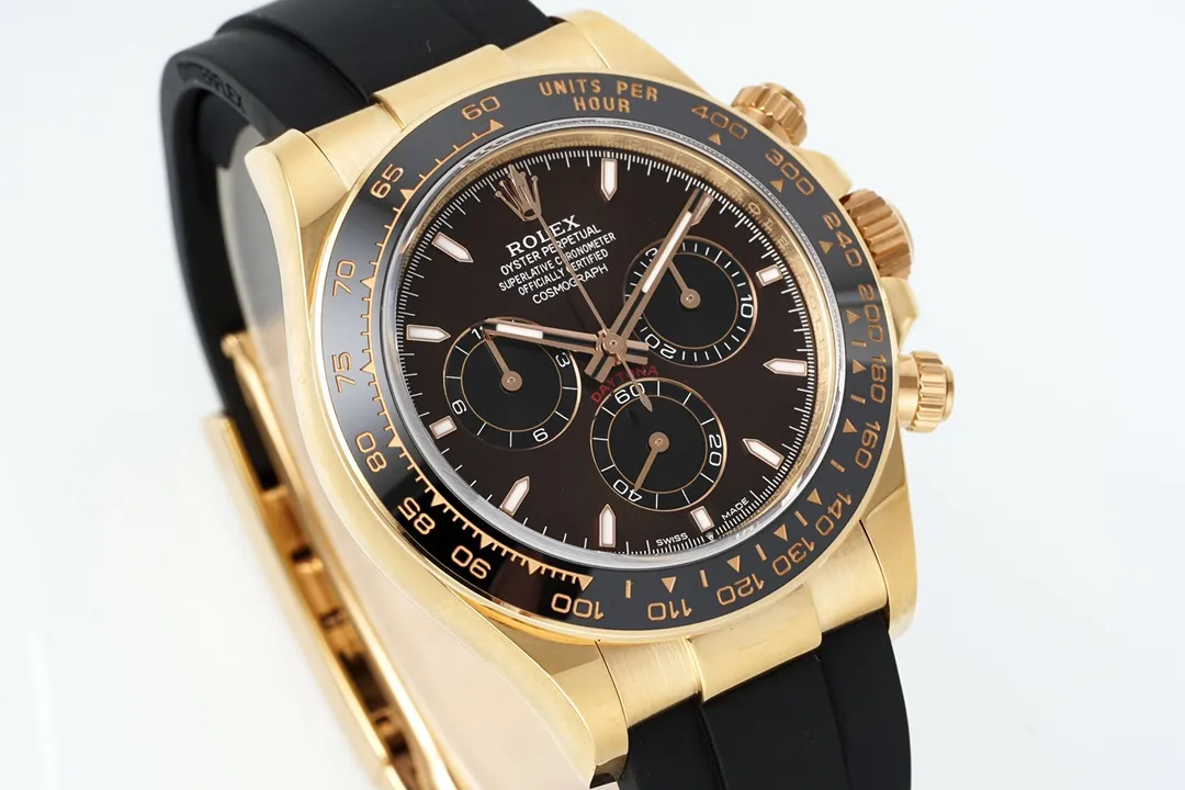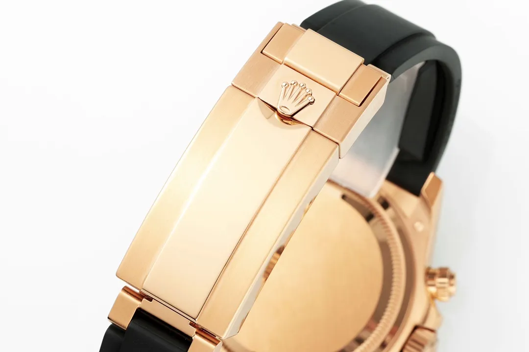 Rolex Daytona Watch – Gold with Black Dial and Rubber Strap – Limited Stock — Premium 1:1 super clone. Case: 904L stainless steel case and bracelet. Crystal: Genuine sapphire crystal with AR coating. Movement: Clone Cal. 4130 (column-wheel flyback chronograph). 12-month movement warranty. Free worldwide shipping on orders over $1,200.