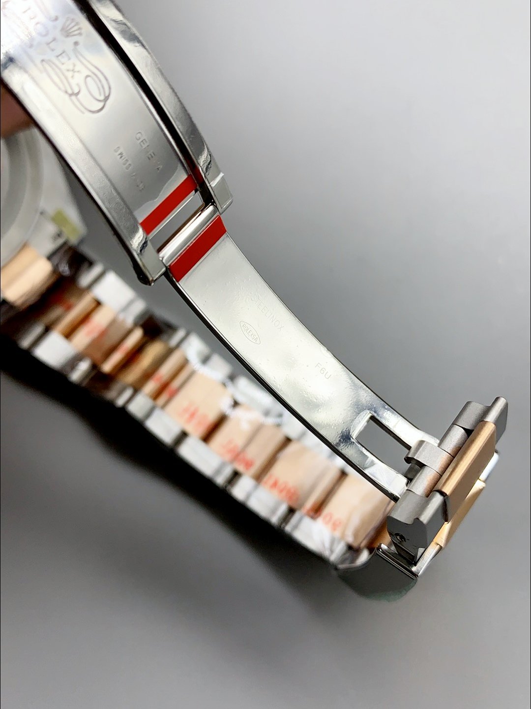 The brown color is over 95% similar in color accuracy/this 95% accuracy is maintained from all angles. Detailed color comparisons will follow. This bezel is independently developed and different from any other version on the market. Bracelet processing brief: The bracelet uses a three-segment splicing + PVD 18k rose gold plating process. The bracelet links are individually plated, a complex process with high manufacturing difficulty. No steel color is visible on the sides.