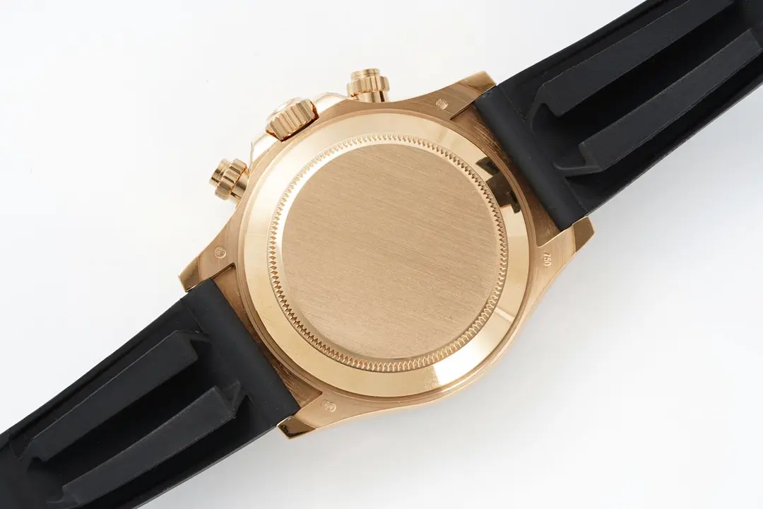 Rolex Yacht-Master 40mm Rose Gold Black Dial Rubber Strap Automatic — Premium 1:1 super clone. Case: 904L stainless steel case and bracelet. Crystal: Genuine sapphire crystal with AR coating. Movement: Clone Rolex caliber (28,800 bph automatic). 12-month movement warranty. Free worldwide shipping on orders over $1,200.