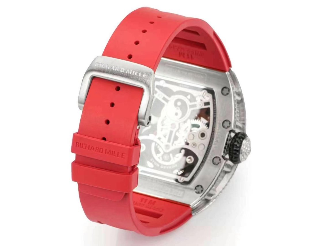 Super Clone Replica RICHARD MILLE RM S10 Koi Fish Tourbillon Watch Diamond Case Red Strap Swiss Quality — Premium 1:1 super clone. Case: Titanium / carbon composite tonneau case. Crystal: Genuine sapphire crystal front and back. Movement: Clone RM caliber (skeletonized automatic). 12-month movement warranty. Free worldwide shipping on orders over $1,200.