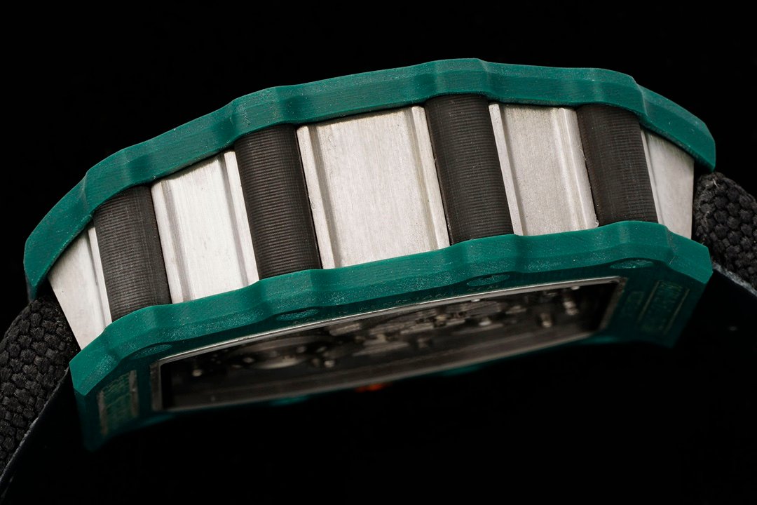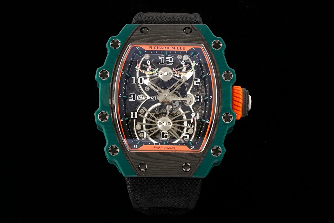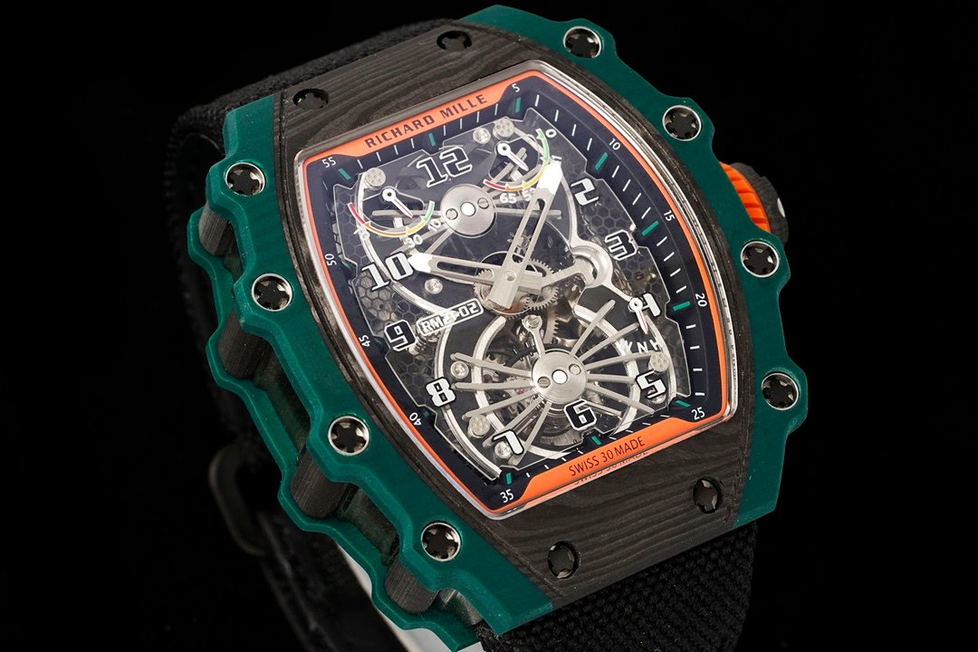 Be a part of the high horology future with the RICHARD MILLE RM 21-02 Replica. This beautiful watch features a striking hexagonal skeleton dial, exposing the intricate Swiss tourbillon movement inside. It is built for performance and comes with a cutting-edge case of Carbon TPT and green Quartz TPT that offers superior strength, lightness, and a unique layered look.