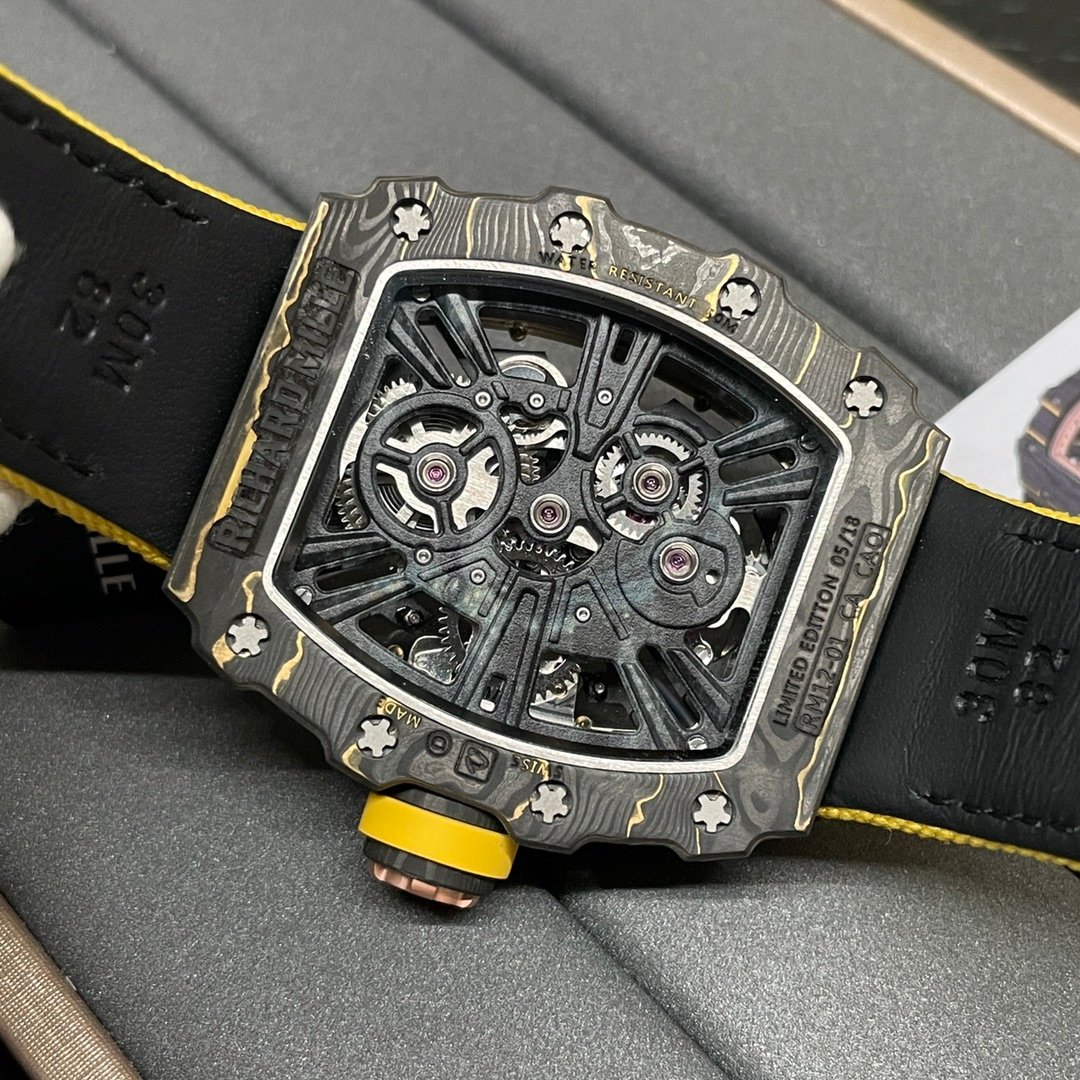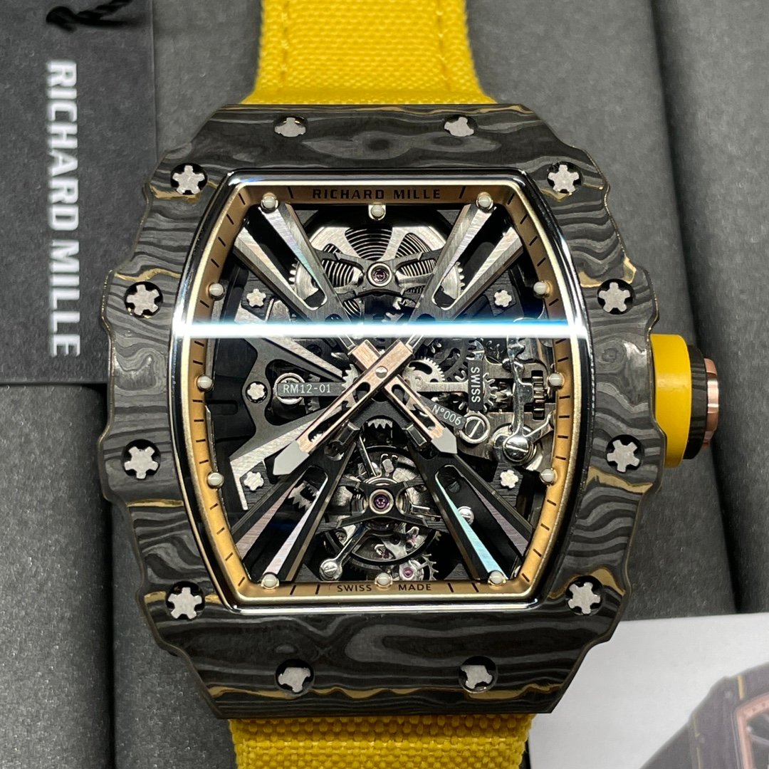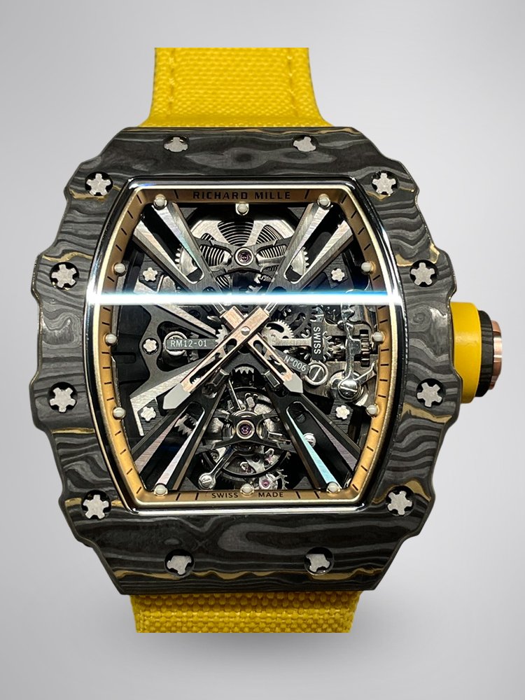 Swiss Replica Richard Mille RM 12-01 Tourbillon Watch – Bold Yellow Fabric Strap, Carbon Fiber Barrel Case, Skeleton Dial — Premium 1:1 super clone. Case: Titanium / carbon composite tonneau case. Crystal: Genuine sapphire crystal front and back. Movement: Clone RM caliber (skeletonized automatic). 12-month movement warranty. Free worldwide shipping on orders over $1,200.