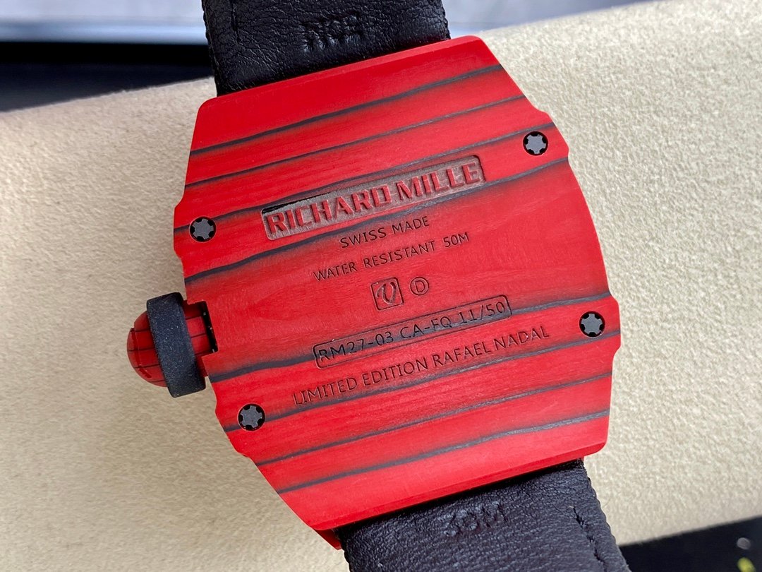 Swiss Replica Richard Mille RM27-03 41mm Red Matador Skeleton Dial Carbon Fiber Case — Premium 1:1 super clone. Case: Titanium / carbon composite tonneau case. Crystal: Genuine sapphire crystal front and back. Movement: Clone RM caliber (skeletonized automatic). 12-month movement warranty. Free worldwide shipping on orders over $1,200.