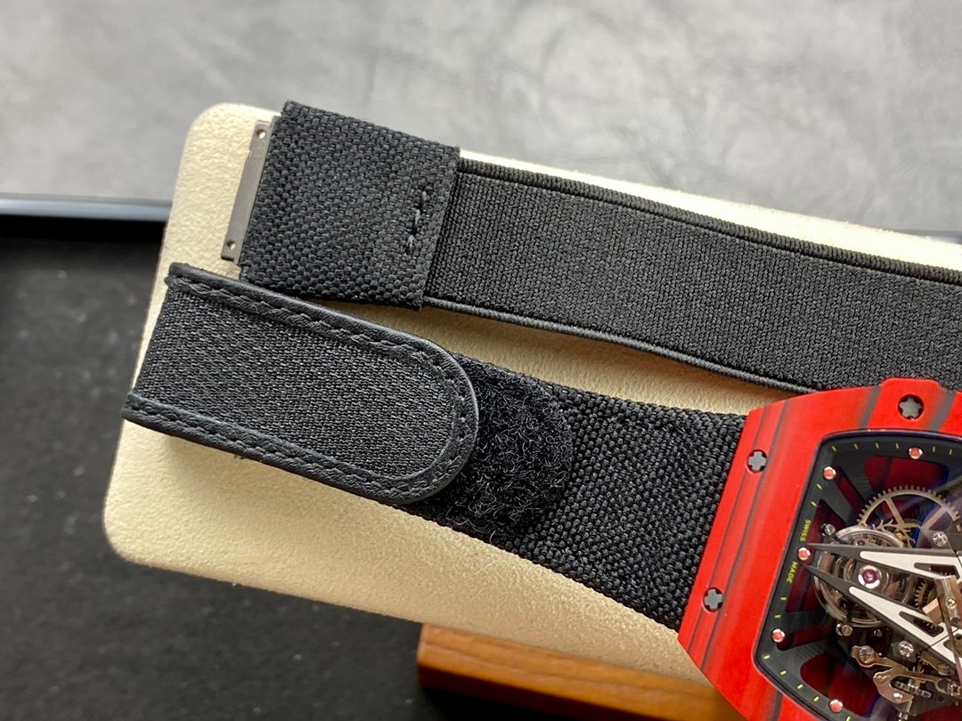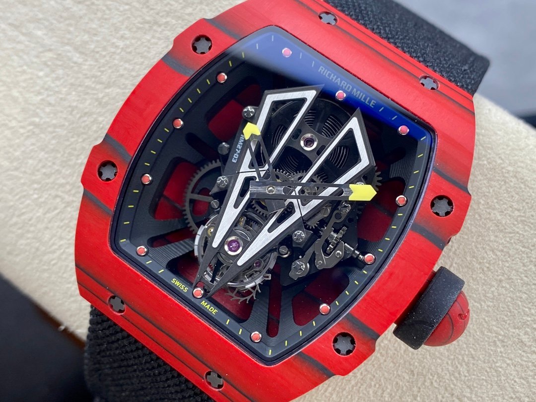 The Best Swiss Replica Richard Mille RM27-03 is a stunning timepiece inspired by the Spanish Matador. Featuring a bold red skeleton dial with a bullhead design, it showcases a visible mainspring barrel, mechanical gears, and tourbillon escapement. Crafted with NTPT carbon fiber and quartz composite technology, the case is lightweight and durable. The red and black striped crown complements the striking design. Paired with a comfortable rubber Velcro strap, sapphire glass, and 50-meter water resistance, this AAA Swiss movement watch is the pinnacle of luxury and craftsmanship.