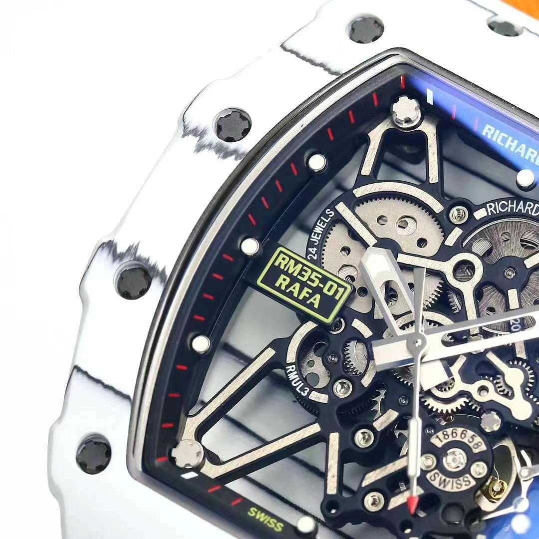 Swiss Richard Mille RM 35-01 Rafael Nadal Replica Watch – White NTPT Carbon Case — Premium 1:1 super clone. Case: Titanium / carbon composite tonneau case. Crystal: Genuine sapphire crystal front and back. Movement: Clone RM caliber (skeletonized automatic). 12-month movement warranty. Free worldwide shipping on orders over $1,200.