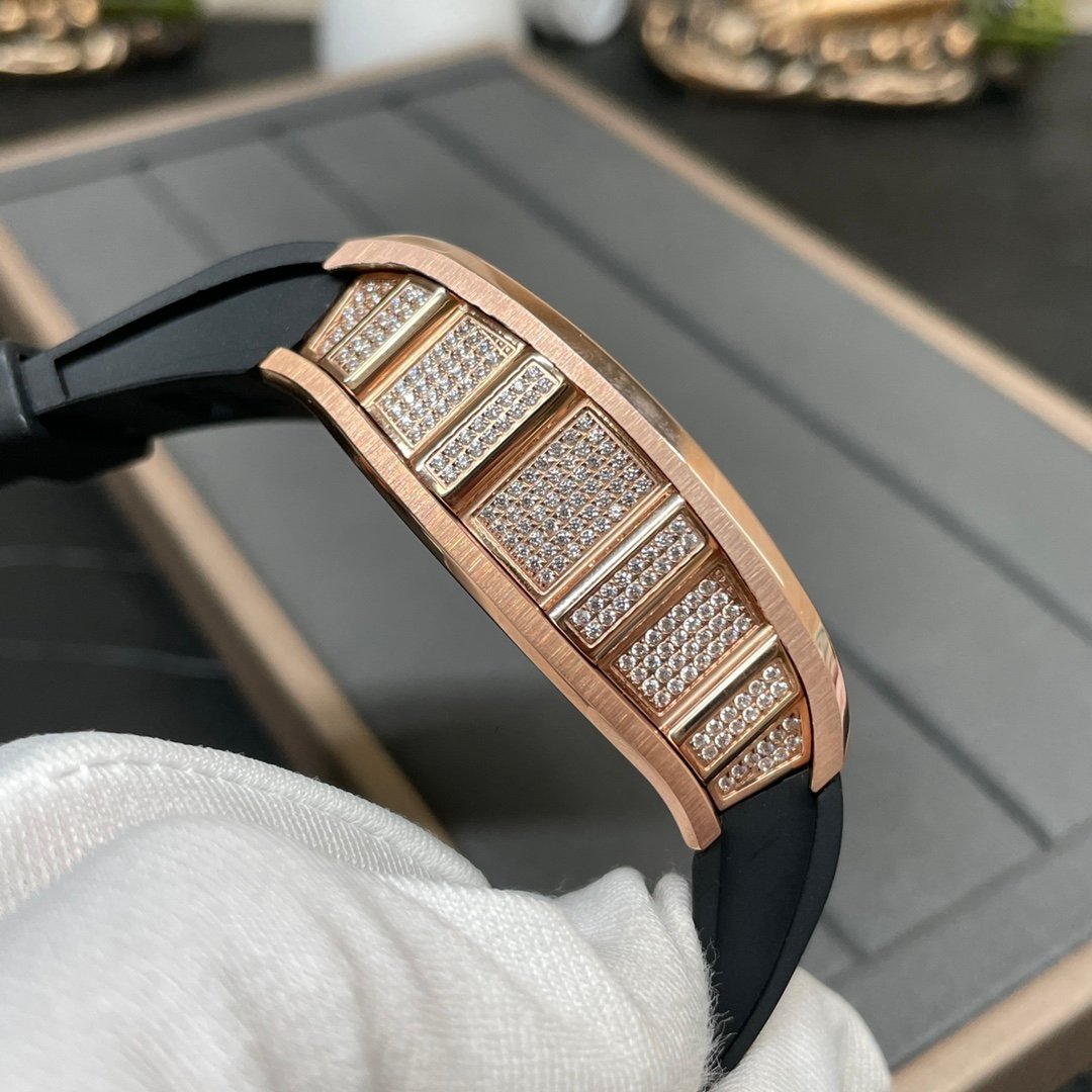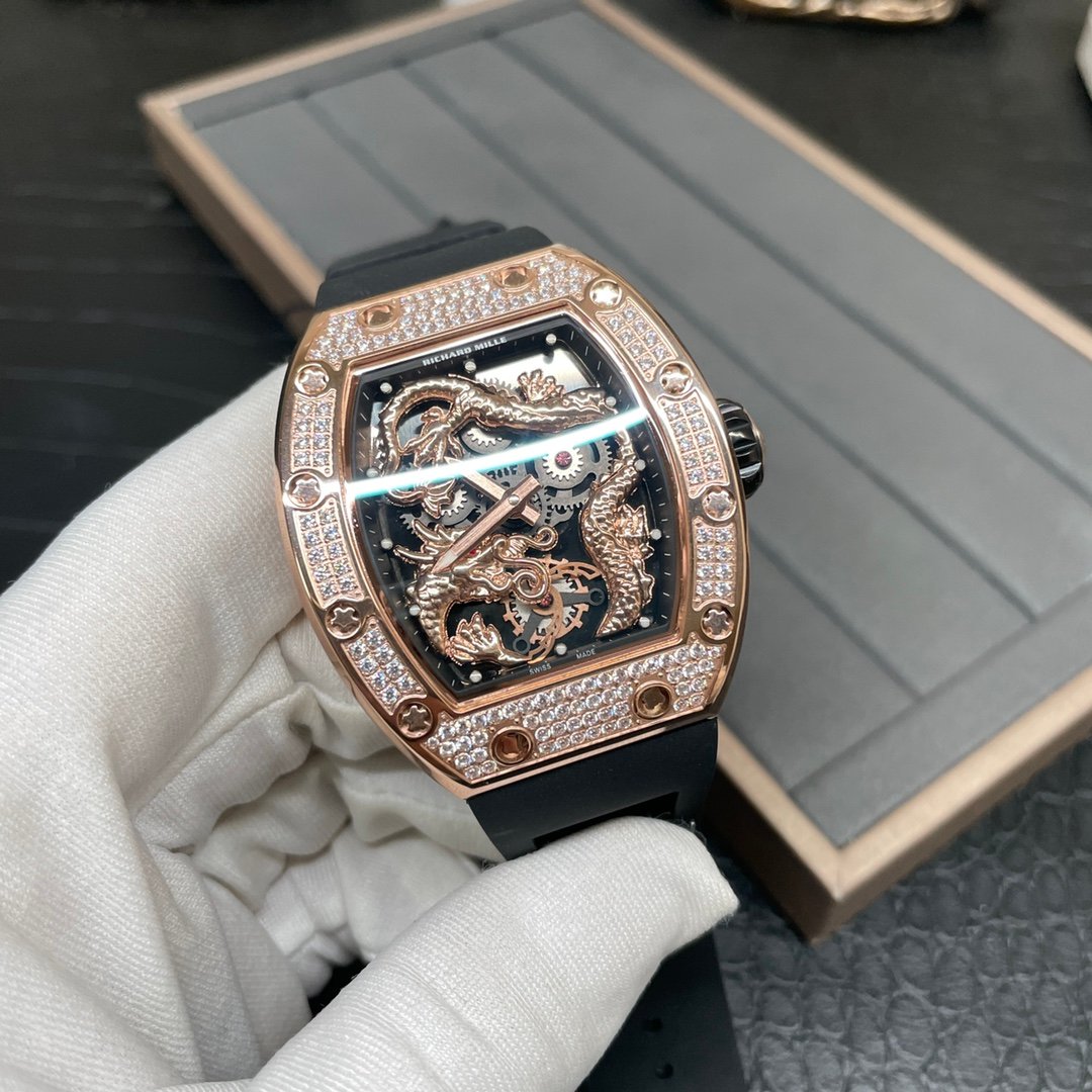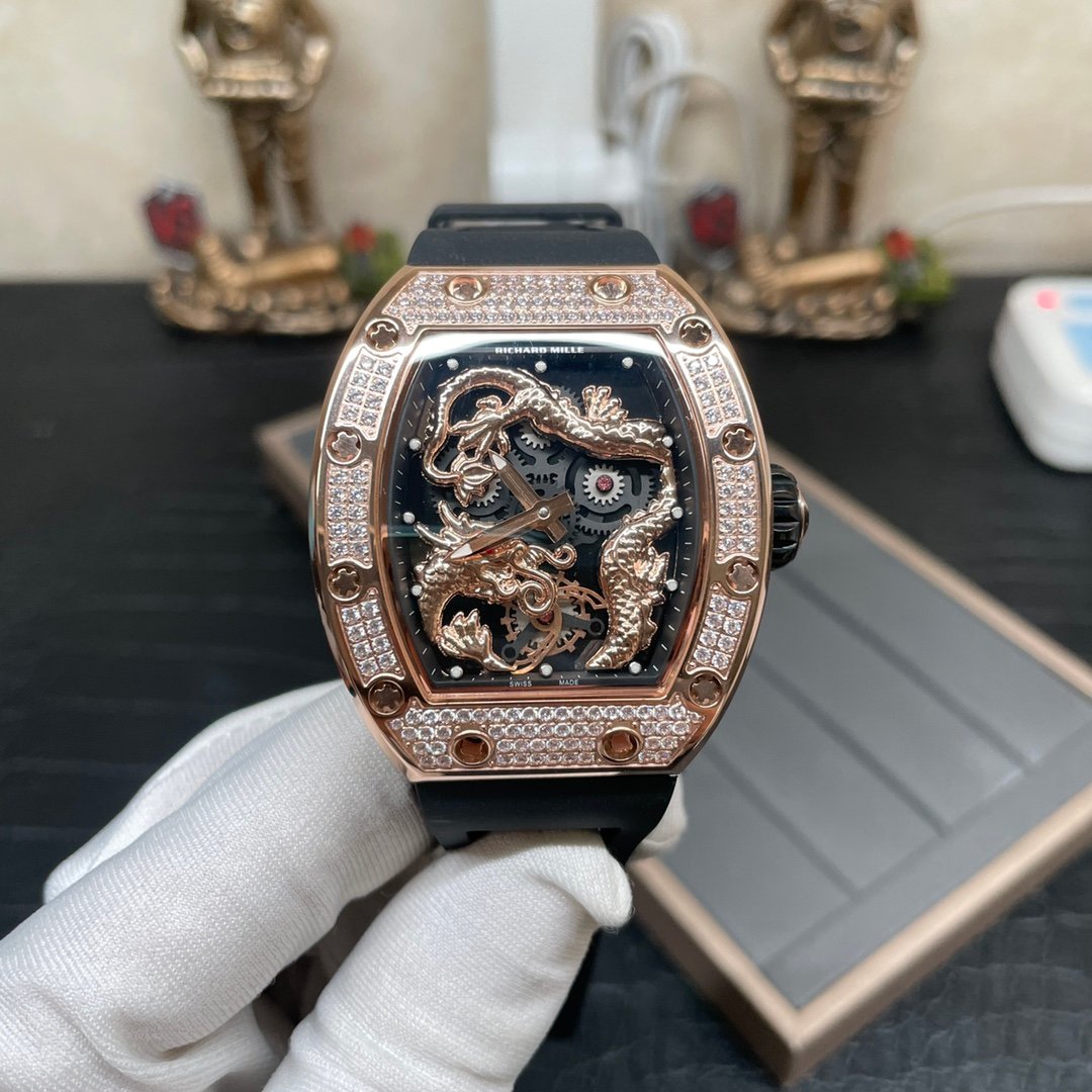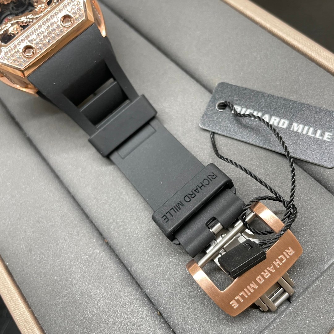 The bezel is fully set with diamonds and plated with rose gold over stainless steel. This design looks bright and elegant. The black rubber strap provides comfort and strength. The sapphire crystal glass is transparent and hardly scratches. Waterproof up to 50 meters. Richard Mille RM 51-01 replica shows power and art in every detail. This watch suits people with bold and refined taste. It is made for those who love to stand out.