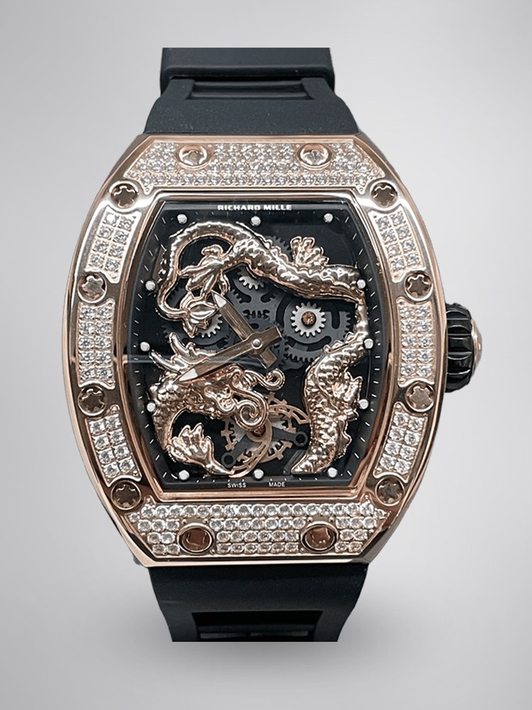 Swiss Richard Mille RM 51-01 Replica Tiger And Dragon Michelle Yeoh Watch with Diamond Bezel And Black Rubber Strap — Premium 1:1 super clone. Case: Titanium / carbon composite tonneau case. Crystal: Genuine sapphire crystal front and back. Movement: Clone RM caliber (skeletonized automatic). 12-month movement warranty. Free worldwide shipping on orders over $1,200.
