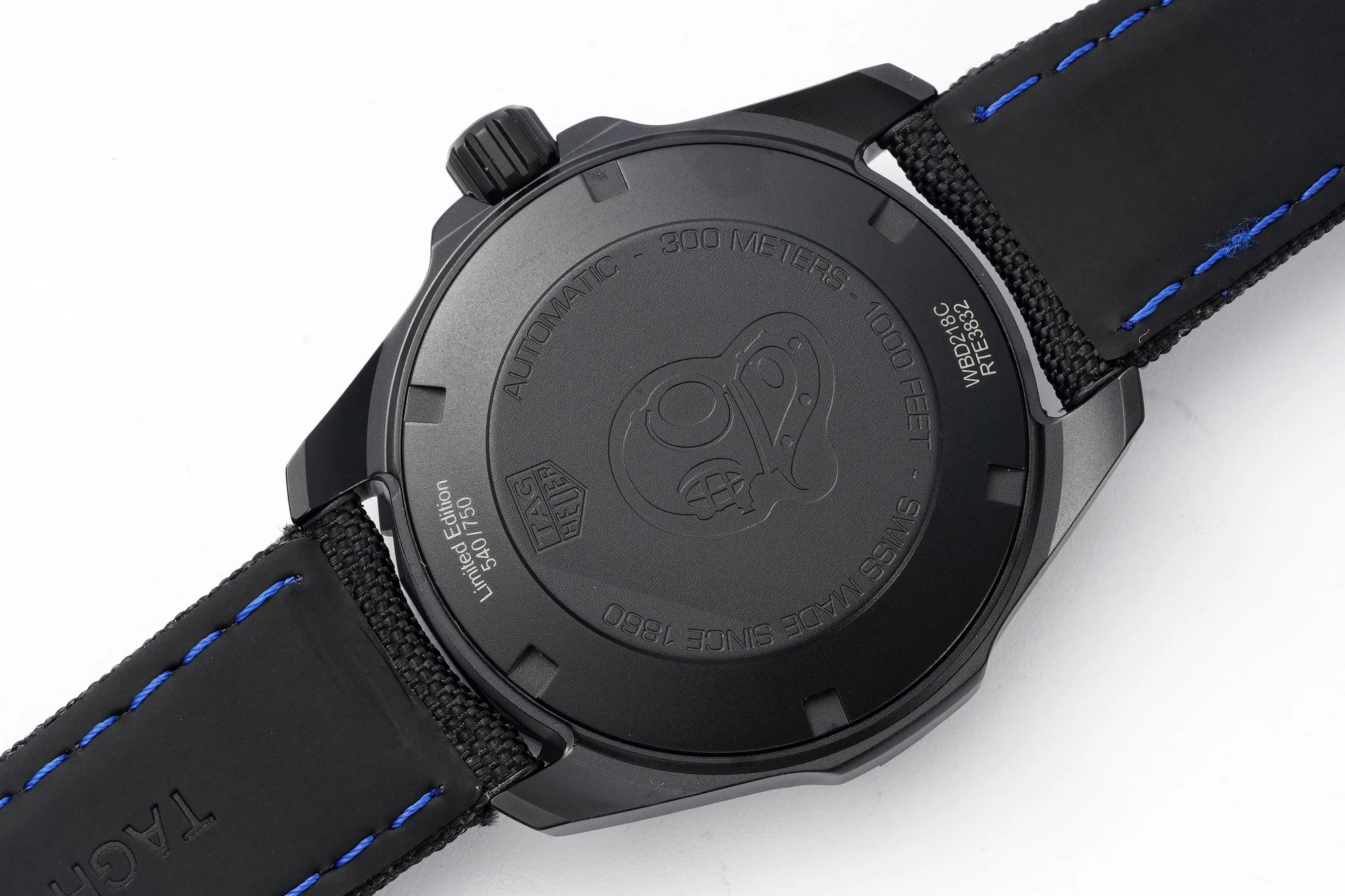 TAG Heuer – Black with Blue Stitching, Casual & Formal Style, 100m Waterproof, SW200 Movement — Premium 1:1 super clone. Case: 316L stainless steel case and bracelet. Crystal: Genuine sapphire crystal with AR coating. Movement: Swiss ETA movement (automatic). 12-month movement warranty. Free worldwide shipping on orders over $1,200.