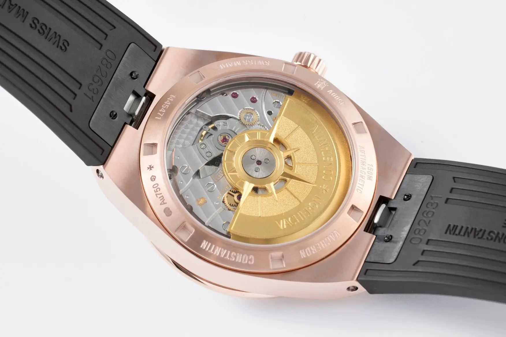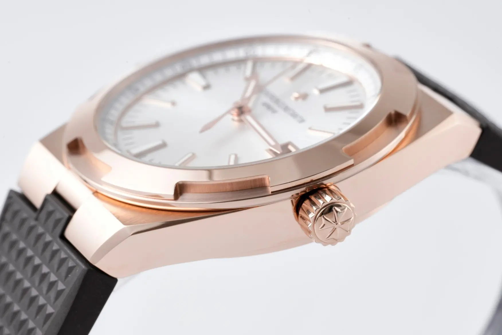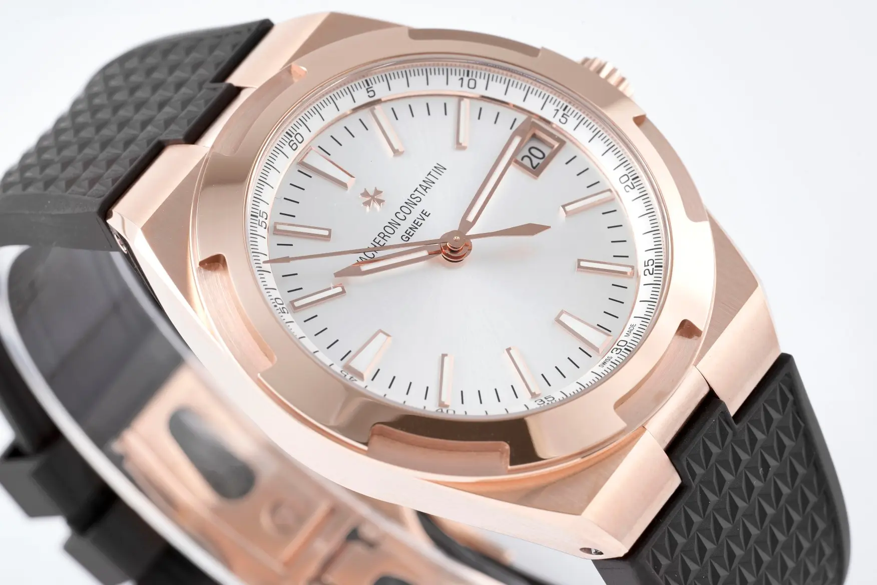 Vacheron Constantin Overseas 4500V Series – Rose Gold Case, Black Rubber Strap, Luxury — Premium 1:1 super clone. Case: 316L stainless steel or 18k gold case. Crystal: Genuine sapphire crystal with AR coating. Movement: Clone Cal. 5100 (28,800 bph, date, power reserve indicator). 12-month movement warranty. Free worldwide shipping on orders over $1,200.