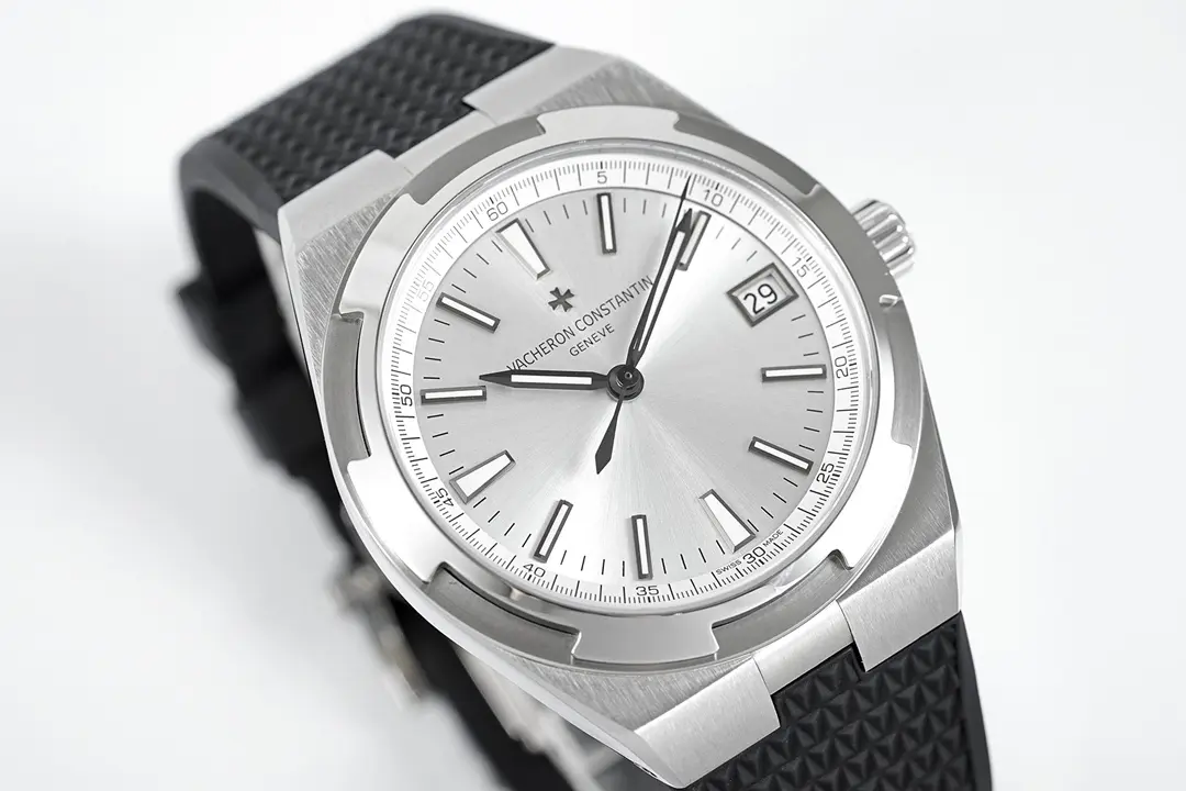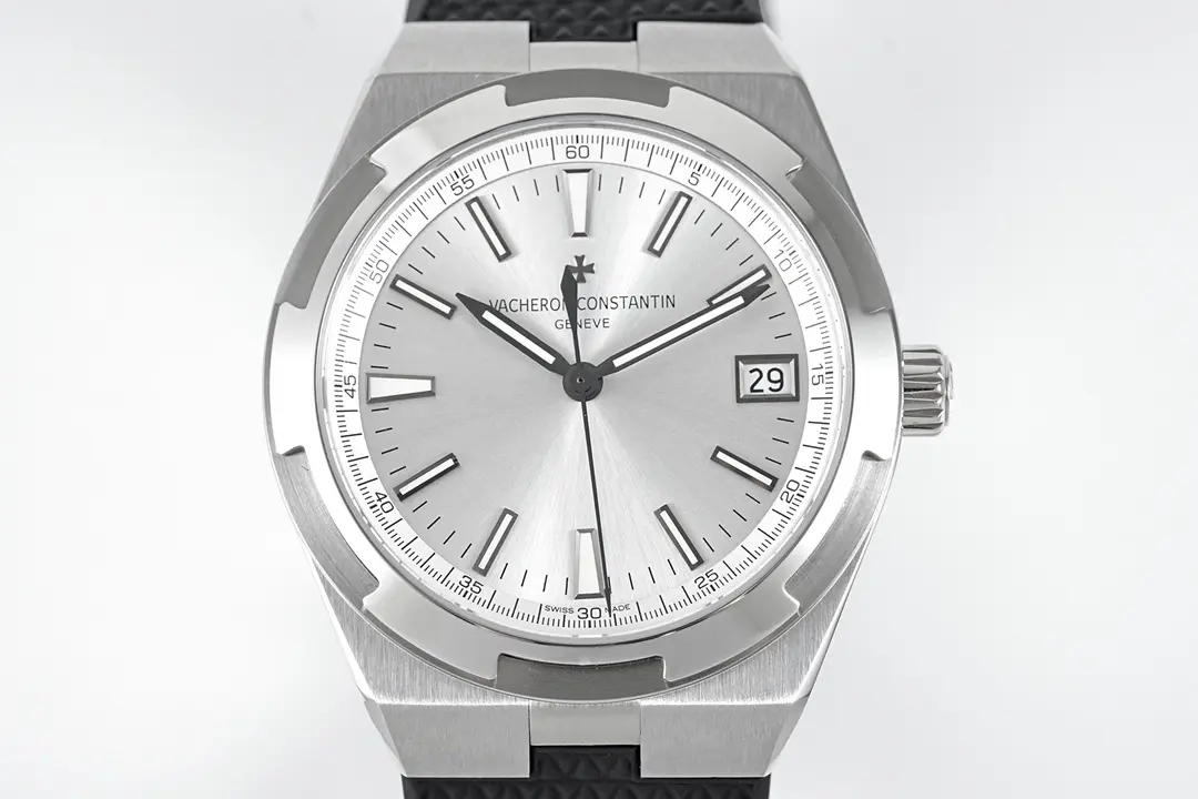 Vacheron Constantin Overseas – Silver Dial, Black Rubber Strap, 41mm Stainless Steel Case — Premium 1:1 super clone. Case: 316L stainless steel or 18k gold case. Crystal: Genuine sapphire crystal with AR coating. Movement: Clone Cal. 5100 (28,800 bph, date, power reserve indicator). 12-month movement warranty. Free worldwide shipping on orders over $1,200.