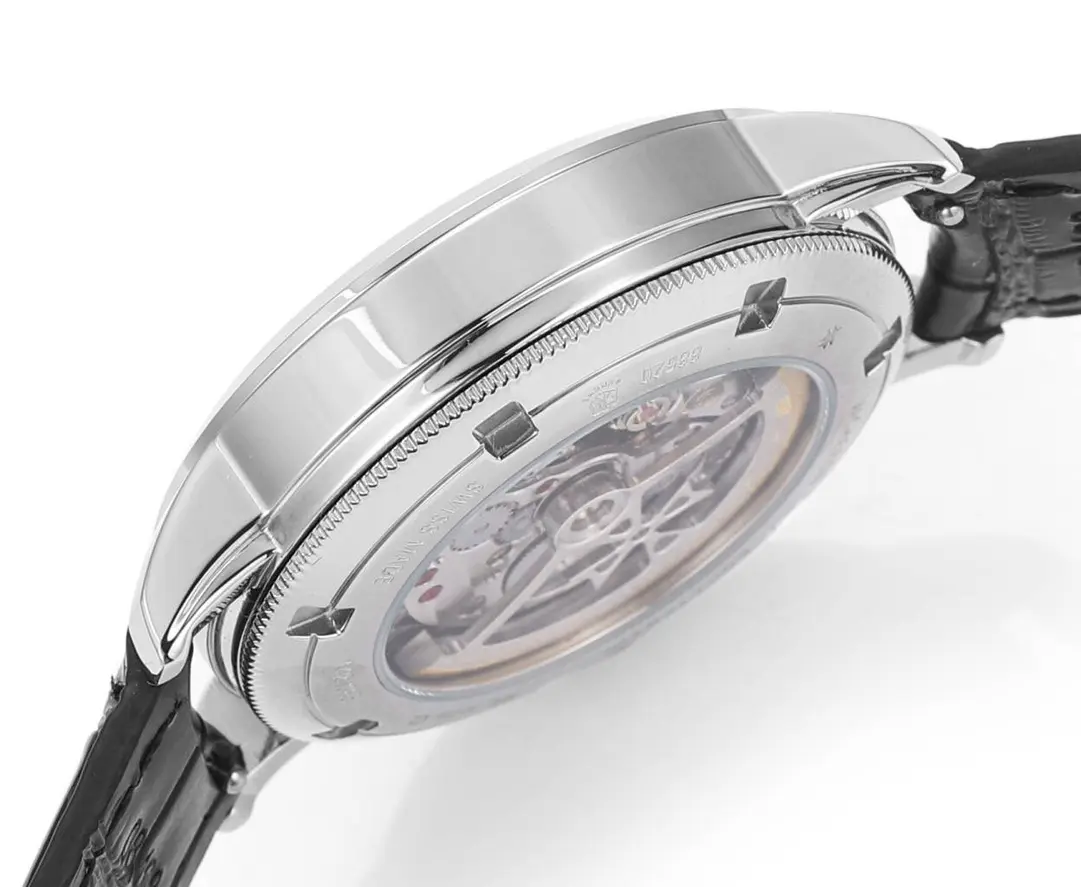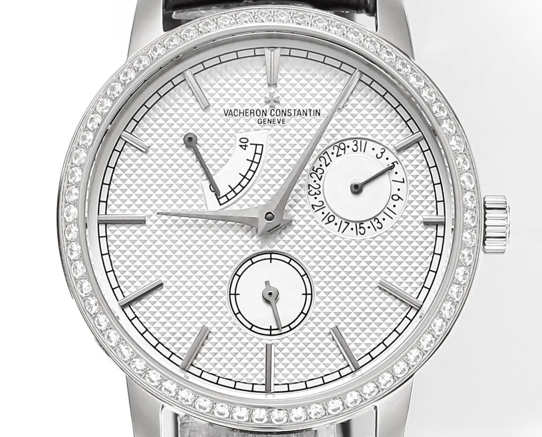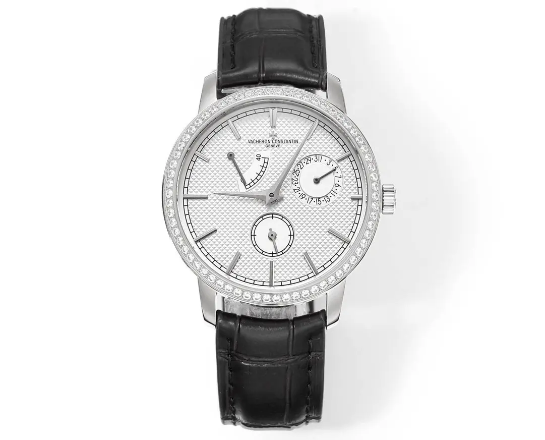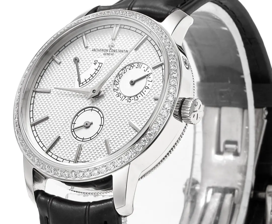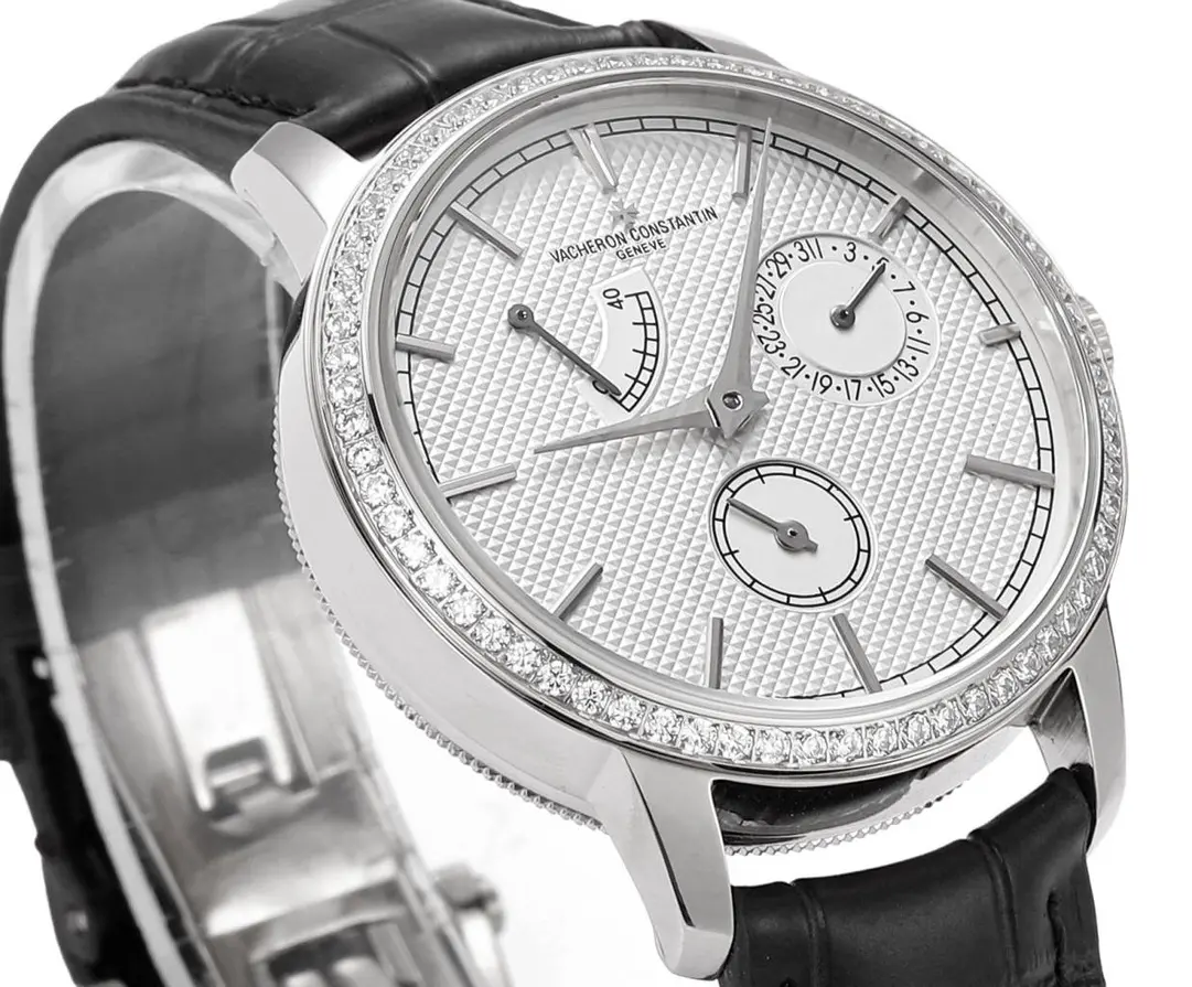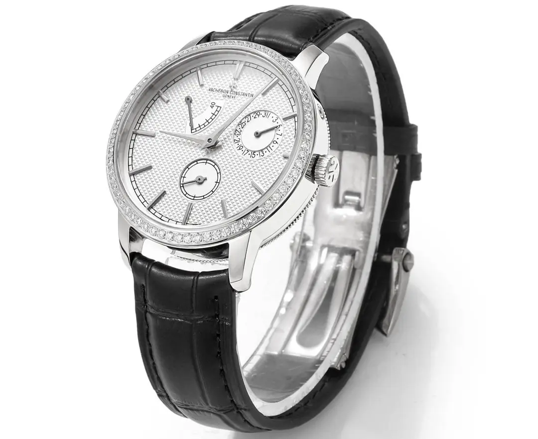 Vacheron Constantin Traditionnelle 83520/000R-9909 – Silver Dial, Black Leather Strap, Multi-Function — Premium 1:1 super clone. Case: 316L stainless steel or 18k gold case. Crystal: Genuine sapphire crystal with AR coating. Movement: Clone Vacheron caliber (mechanical automatic). 12-month movement warranty. Free worldwide shipping on orders over $1,200.