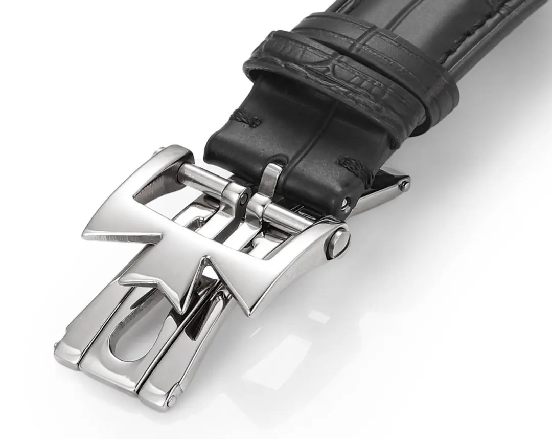 - Elegant Design: This watch features a silver dial that has a texture pattern. It is paired with a leather strap in black, giving it a luxurious and classic look.